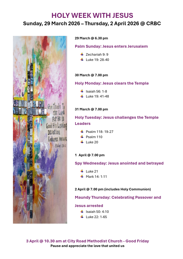 Join us for a series of evening study and exploration from Palm Sunday through to Maundy Thursday. Good Friday sees us join together with St Germains, Christ Church Summerfield and City Road Methodist acknowledging our unity in Christ Jesus.